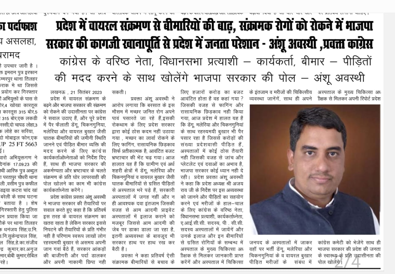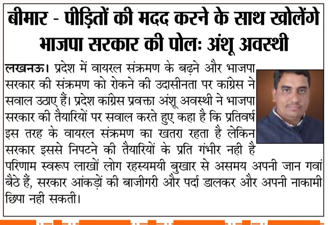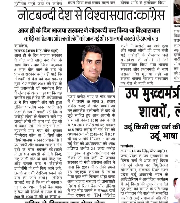 उप मुख्यमंत्री केशव प्रसाद मौर्या द्वारा लोकसभा में नेता विपक्ष राहुल गांधी जी के ऊपर की गई टिप्पणी पर प्रतिक्रिया उप मुख्यमंत्री केशव मौर्या जी को भाजपा ने कुर्सी देने के बजाय स्टूल पकड़ा दिया, इसीलिए वह अपनी भड़ास अपने पार्टी नेताओं पर न निकालकर कांग्रेस पर निकाल कर अपने कलेजे को शांति देने की कोशिश कर रहे, - अंशू अवस्थी, प्रवक्ता कांग्रेस। Read More